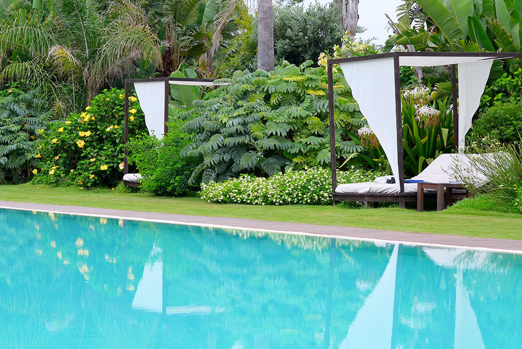 Scopri palme, lentischi, bouganville, lavanda, mirto e rosmarino, arricchiti da tocchi esotici che donano fascino tropicale. I vialetti in pietra sarda e le aiuole sinuose ti conducono alla scoperta di scorci sempre nuovi, dove il verde si riflette sull’azzurro delle piscine.